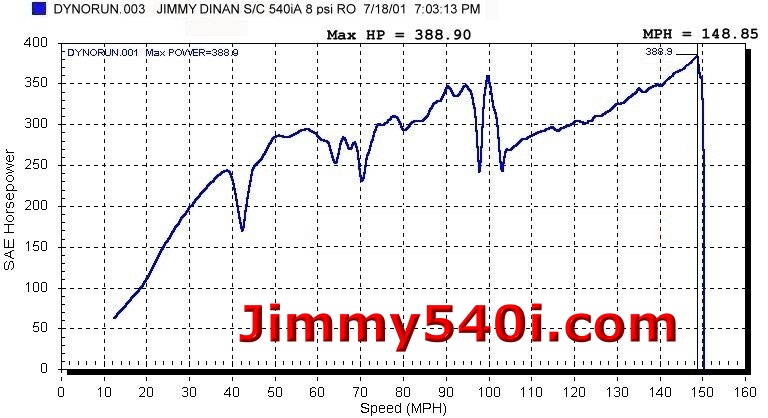 DINAN SUPERCHARGER (with a built-in DINAN Cold-Air-Intake, Blow-Off-Valve, Intake Manifold & Throttle Body) ~ This is my favorite Dinan Modification. It delivers unparalleled acceleration, every-day drivability and reliability enthusiasts have come to expect from Dinan tuned BMW. My Dinan Supercharged 540i recorded 485 horsepower at the flyhweel (388.0 Rear Wheel Horsepower @ the Rear Wheel on Dyno Jet + 20% Automatic Transmission Power Loss: 388 RWHP divided by 80% = 485 HP) and 421 lb/ft of torque@ the Crank (337 lb/ft @ the Rear Wheel on Dyno Jet + 20% Power Loss:337 lb/ft divided by 80% = 421.25 lb/ft Torque). My 540i accelerates like a Rocket, Period! (Please click on the picture above to see the Dyno Result!)